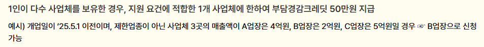 - 중복 지원 제한: 1인이 다수 사업체(법인·개인 무관)의 대표인 경우 1곳만 신청 가능, 공동대표가 운영하는 사업체는 주대표 1인만 신청 가능