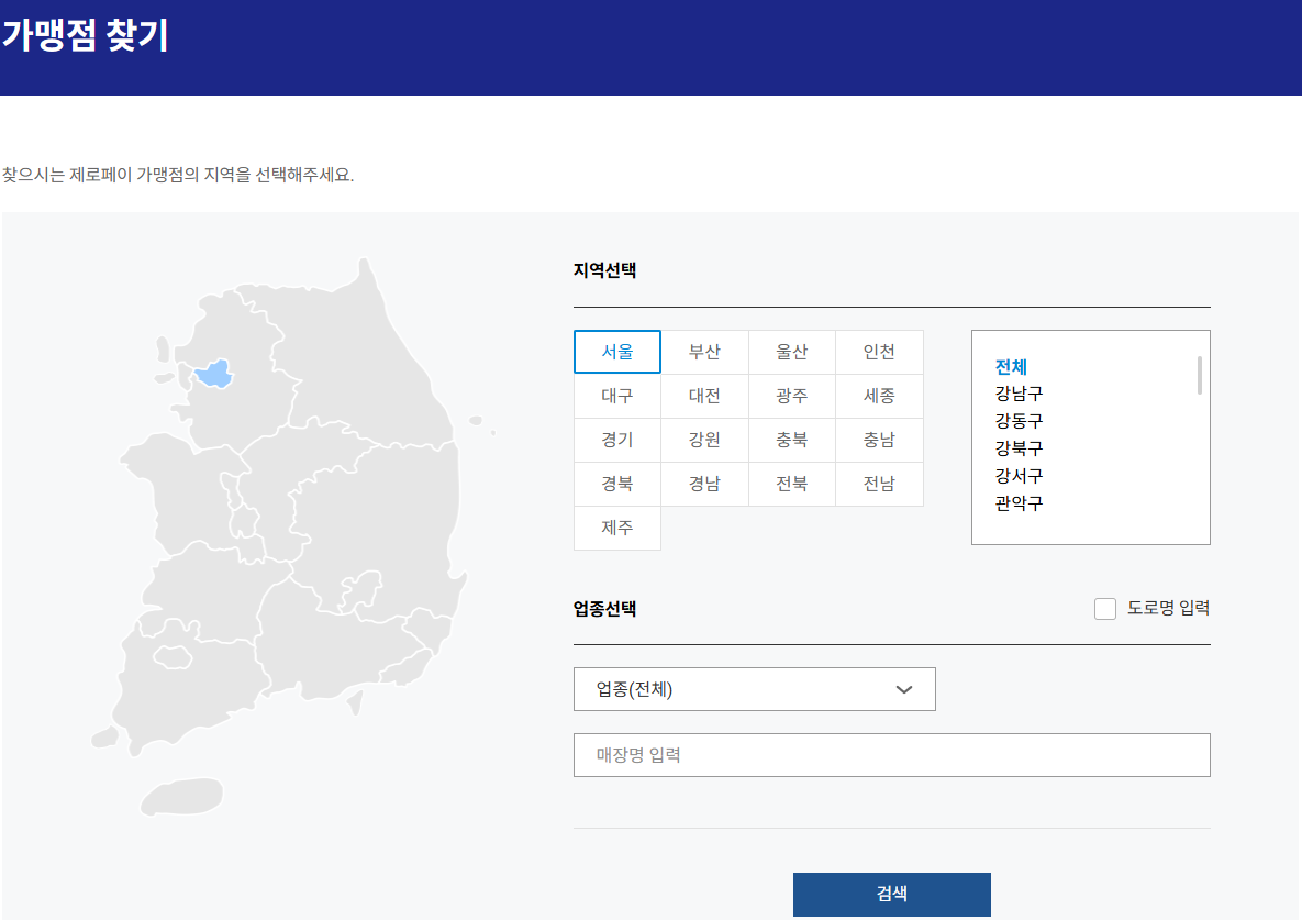 - '가맹점 찾기' 메뉴 이동: 웹사이트 하단 메뉴에서 '가맹점 찾기'를 클릭합니다.