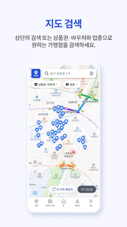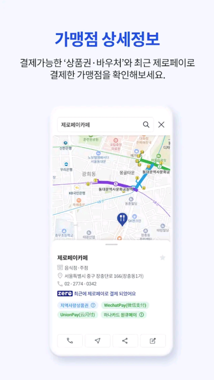 - 위치 기반 검색: GPS를 활성화하면 현재 위치를 중심으로 지도가 나타나며, 지도 위에 가맹점 위치가 표시됩니다.