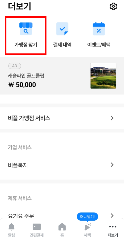 - '가맹점 찾기' 메뉴 선택: 앱 메인 화면이나 메뉴에서 '가맹점 찾기' 또는 '내 주변 가맹점' 버튼을 누릅니다.