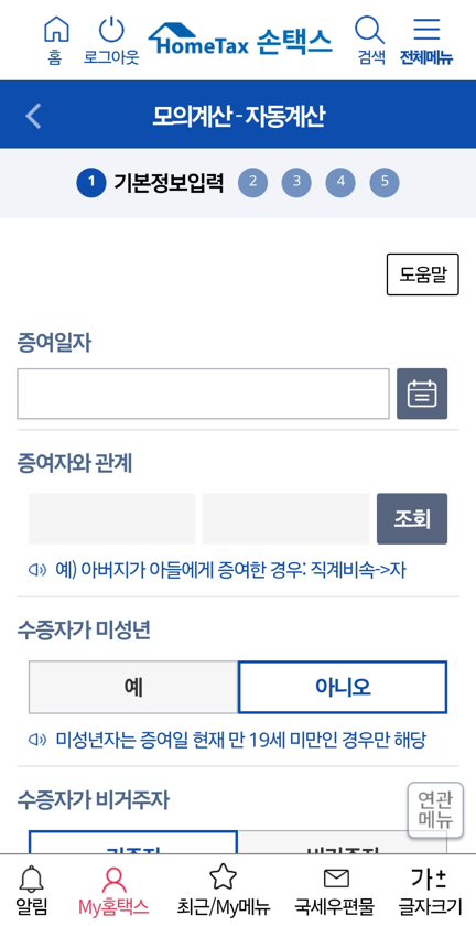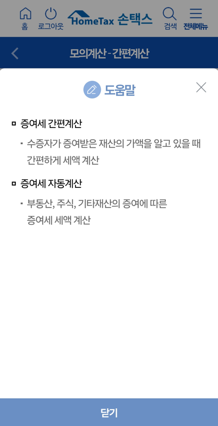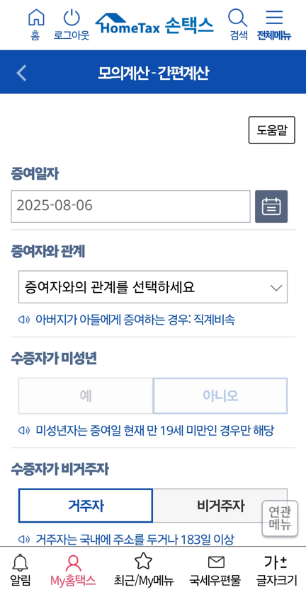 - 국세청 홈택스 홈페이지 접속 후 '세금 종류별 서비스' → '상속/증여세' → '증여세 미리 계산' 메뉴로 이동합니다.